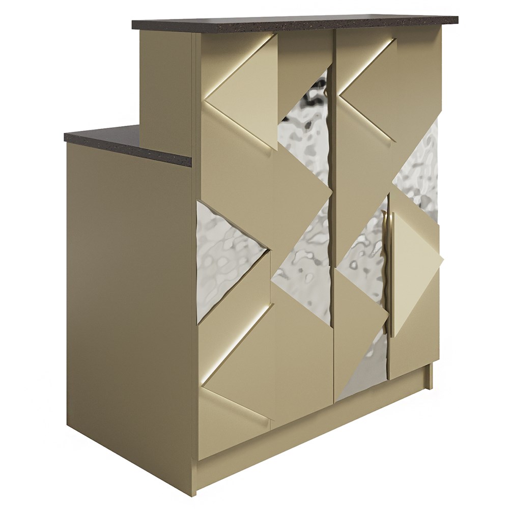 Габариты (ШхГхВ) : 1004х686х1190 мм \; Материал корпуса : ЛДСП 16 мм., кромка ПВХ 2 и 0,4 мм. \; Материал фасада : ЛДСП 16 мм., кромка ПВХ 0,4 мм., МДФ 16 и 25 мм., отделка ЛКМ – покраска по RAL Classic, нержавеющая сталь\; Столешница рабочая и гостевая : ЛДСП 25 мм., кромка ПВХ 2 мм \; Подсветка : LED (под столешницей - дополнительная опция, в фасаде входит в стоимость)\;