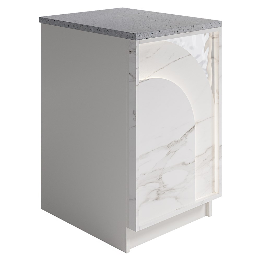 Габариты (ШхГхВ) : 504х654х865 мм \; Материал корпуса : ЛДСП 16 мм., кромка ПВХ 2 и 0,4 мм. \; Материал фасада : ЛДСП 16 мм., кромка ПВХ 0,4 мм., МДФ 16 и 25 мм., отделка ЛКМ – покраска по RAL Classic, нержавеющая сталь полированная 1 мм. \; Столешница рабочая : ЛДСП 25 мм., кромка ПВХ 2 мм \; Подсветка : LED (под столешницей - дополнительная опция, в фасаде входит в стоимость)\;