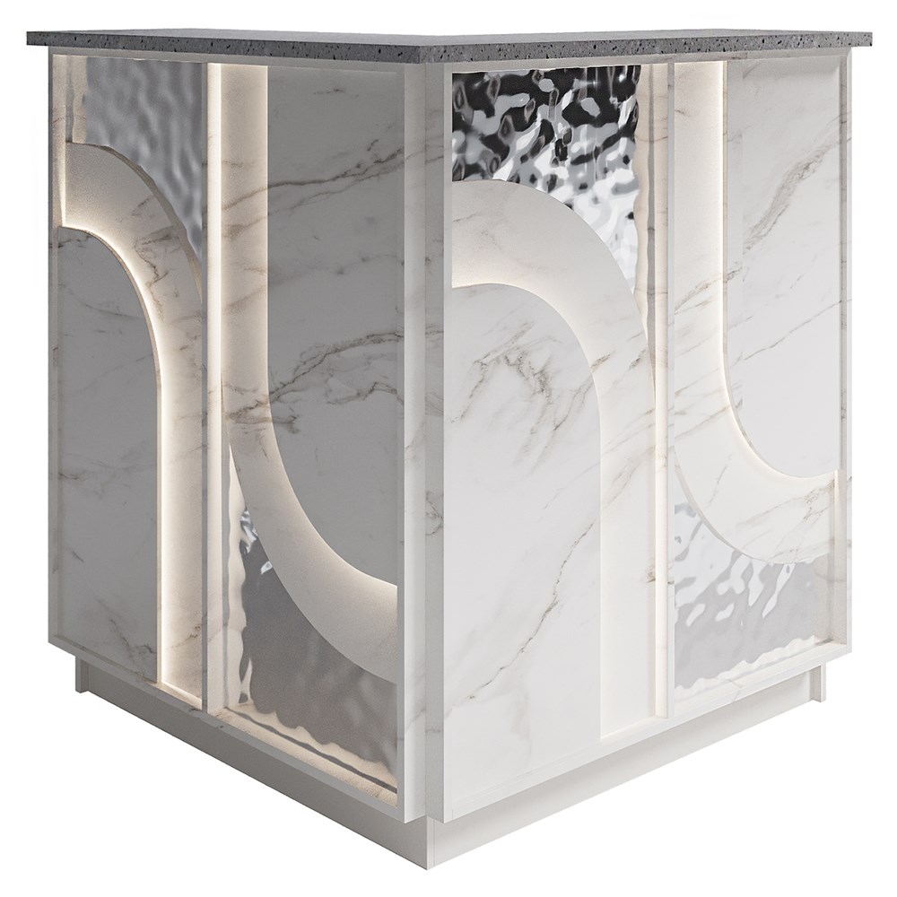 Габариты (ШхГхВ) : 1052х1052х1190 мм \; Материал корпуса : ЛДСП 16 мм., кромка ПВХ 2 и 0,4 мм. \; Материал фасада : ЛДСП 16 мм., кромка ПВХ 0,4 мм., МДФ 16 и 25 мм., отделка ЛКМ – покраска по RAL Classic, нержавеющая сталь полированная 1 мм. \; Столешница рабочая и гостевая : ЛДСП 25 мм., кромка ПВХ 2 мм \; Подсветка : LED (под столешницей - дополнительная опция, в фасаде входит в стоимость)\;