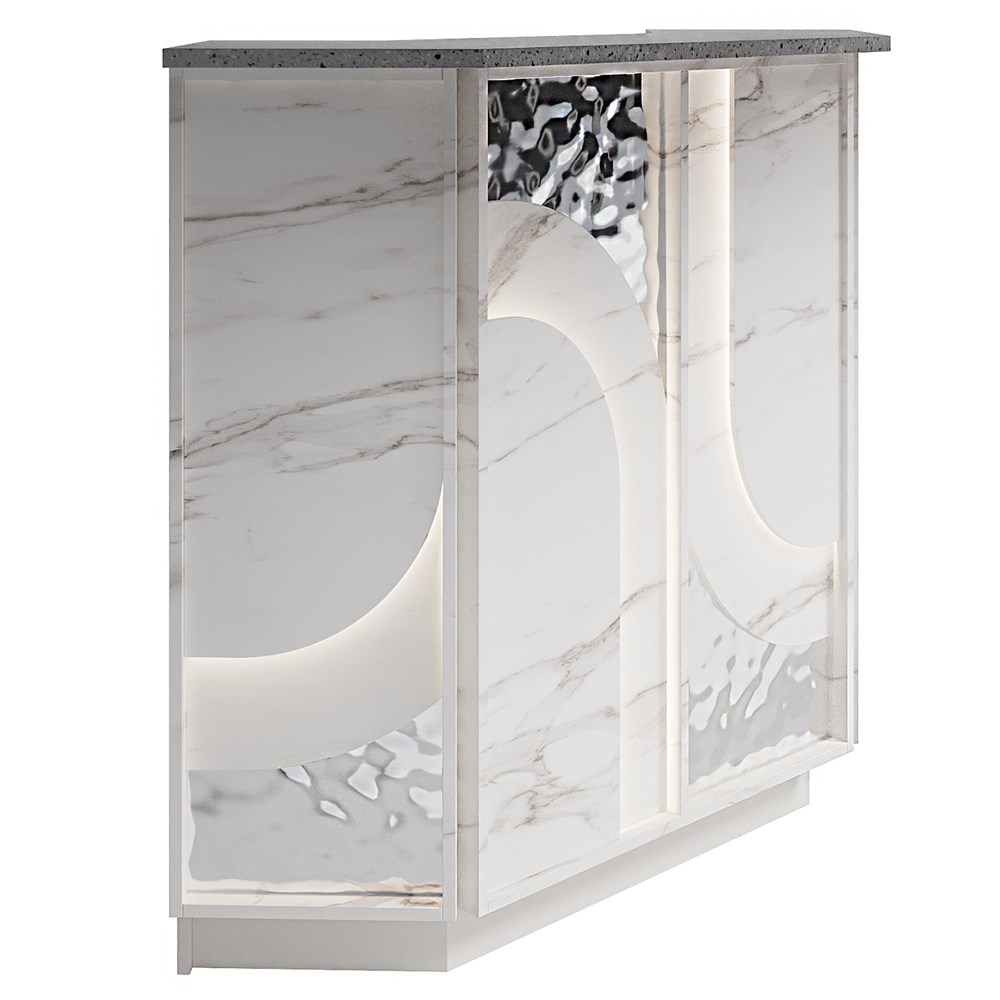Габариты (ШхГхВ) : 1000х1000х1190 мм \; Материал корпуса : ЛДСП 16 мм., кромка ПВХ 2 и 0,4 мм. \; Материал фасада : ЛДСП 16 мм., кромка ПВХ 0,4 мм., МДФ 16 и 25 мм., отделка ЛКМ – покраска по RAL Classic, нержавеющая сталь полированная 1 мм. \; Столешница рабочая и гостевая : ЛДСП 25 мм., кромка ПВХ 2 мм \; Подсветка : LED (под столешницей - дополнительная опция, в фасаде входит в стоимость)\;