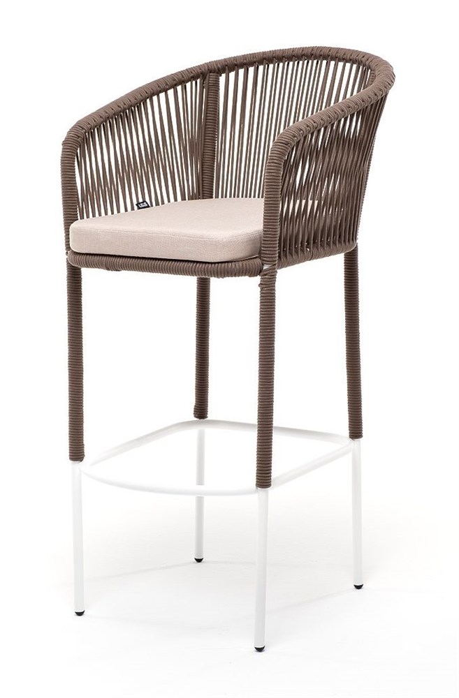 Габариты товара (ДхШхВ) : 590x510x1070 мм\; Вес (Нетто) : 10.5 кг\; Цвет ткани : бежевый\; Материал ткани : полиэстер 100% плотностью 300гр/м2 с влагоотталкивающей пропиткой\; Высота сидения : 810 мм\; Цвет каркаса : белый\; Материал каркаса : сталь\; Вид роупа : круглый\; Цвет плетения : коричневый\; Материал плетения : эластичные ленты из высокопрочных полиэфирных волокон (роуп)\; Габариты упаковки (ДхШхВ) : 610x540x1090 мм\;