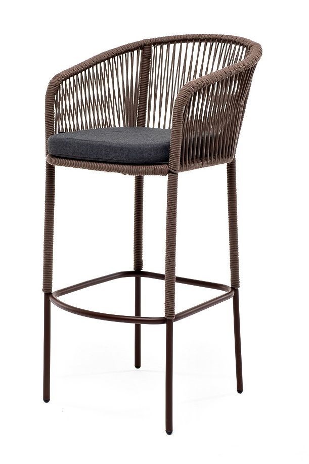 Габариты товара (ДхШхВ) : 590x510x1070 мм\; Цвет ткани : темно-серый\; Материал ткани : полиэстер 100% плотностью 300гр/м2 с влагоотталкивающей пропиткой\; Высота сидения : 810\; Фактура покрытия каркаса : муар\; Цвет каркаса : коричневый (RAL8016)\; Материал каркаса : сталь\; Вид роупа : круглый\; Цвет плетения : коричневый\; Материал плетения : эластичные ленты из высокопрочных полиэфирных волокон (роуп)\; Габариты упаковки (ДхШхВ) : 610x540x1090 мм\; Вес (Нетто) : 10.5 кг\;