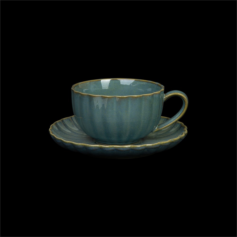 Тип посуды: чайная пара\; Серия: Corone Calypso\; Материал: фарфор\; Форма: традиционная\; Основной цвет: сине-зеленый\; Номинальный объем, мл: 270\; Особенности: диаметр блюдца 150 мм\;