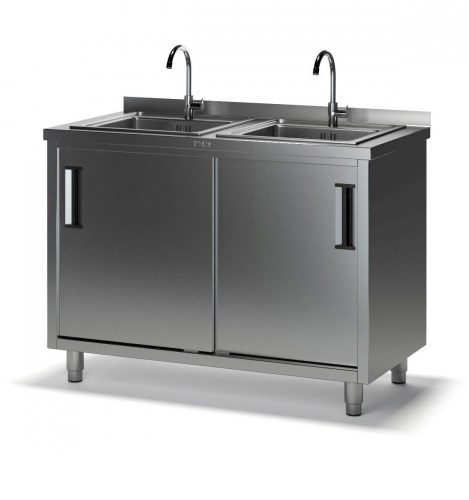 Двухсекционная ванна моечная СКМ-2 с тумбой с бортом (1500х600х870), 2 мойки цельн. накладные 400х500х140, отверстие под смеситель сбоку