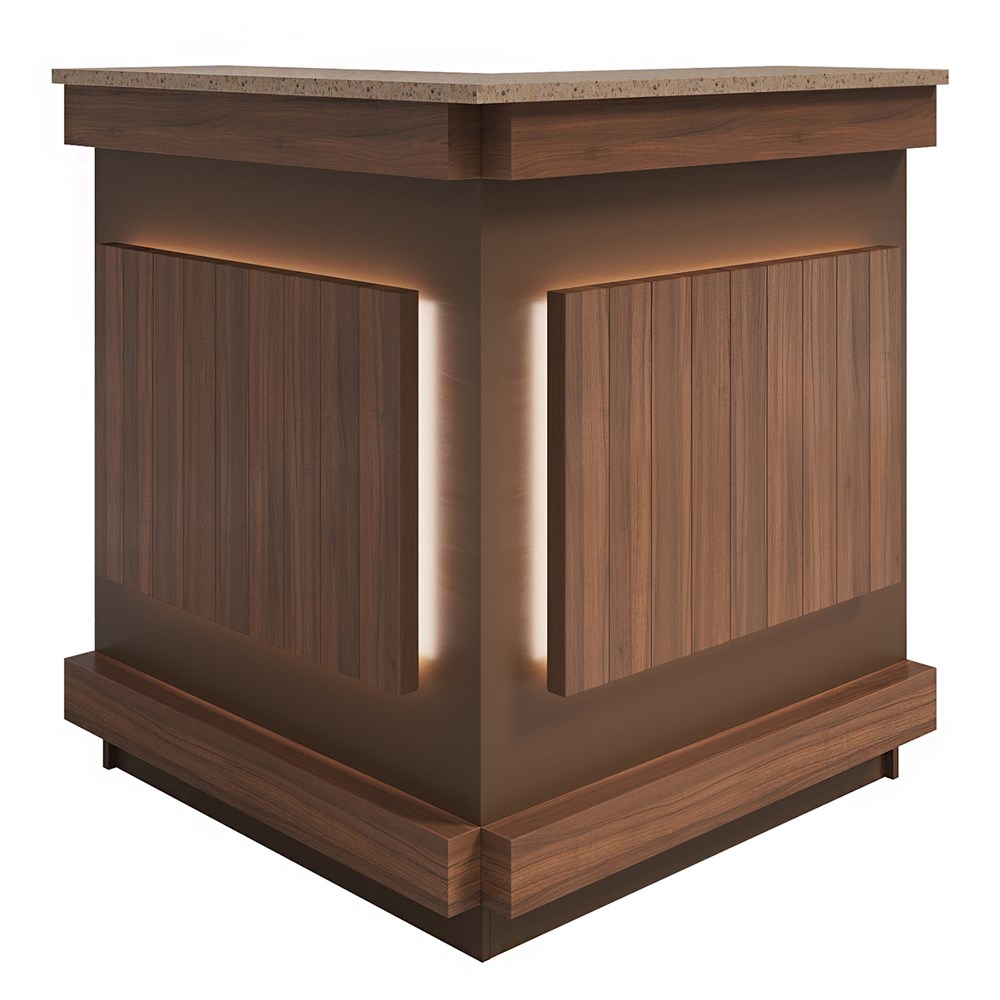 Габариты (ШхГхВ) : 1052х1052х1190 мм \; Материал корпуса : ЛДСП 16 мм., кромка ПВХ 2 и 0,4 мм. \; Материал фасада : ЛДСП 16мм, кромка ПВХ 0,4мм. Массив сосны 30 и 45мм, отделка ЛКМ - тонировка, лак матовый. \; Столешница рабочая и гостевая : ЛДСП 25 мм., кромка ПВХ 2 мм \; Подсветка : LED (под столешницей - дополнительная опция, в фасаде входит в стоимость)\;