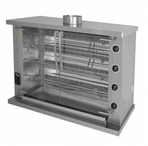 Питание, В: Газ\; Мощность, кВт: 18\; Темп. режим, °С: 50-280\; Вместимость: 35 цыплят\; Конструкция: шампурный\; Количество корзин/шампуров: 7\; Габаритные размеры, мм: 1297х582х976\;