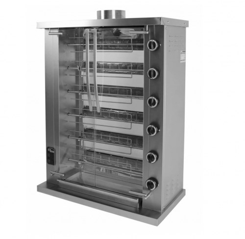 Питание, В: Газ + 220В\; Мощность, кВт: 1 902\; Темп. режим, °С: 50-260\; Вместимость: 18\; Конструкция: шампурный\; Количество корзин/шампуров: 6\; Габаритные размеры, мм: 967х517х1316\;