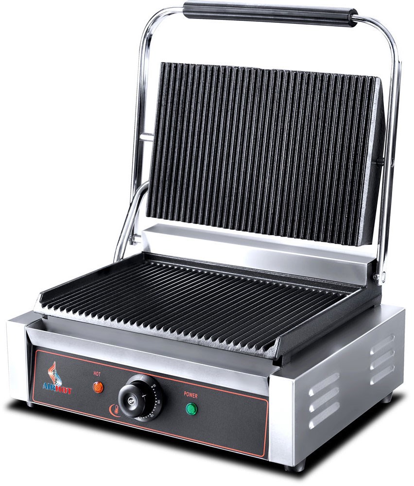 Габаритные размеры : 425х400х220 мм\; Мощность : 2 кВт\; Напряжение : 220 В\; Вес : 17,5 кг\; Температурный режим : от 50 до 300 °C\; Тип гриля : одинарный\; Материал рифленых поверхностей : чугун\; Размер рабочих поверхностей : 335х218 мм верхняя, 356х277 мм нижняя\; Терморегулятор : да\; Съемный поддон : да\;