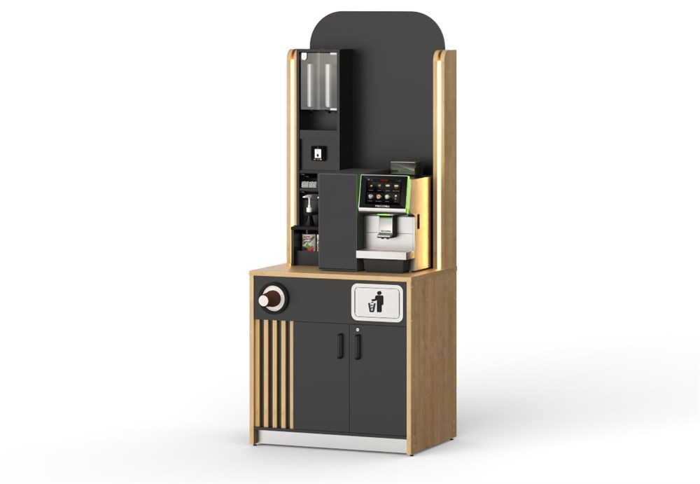 Габариты (ШхГ) : 950х695 мм \; Высота : 2370/950 мм \; Назначение : Кофе-модуль самообслуживания \; Тип : напольный пристенный / островной \; Материал : ЛДСП Egger, нержавеющая сталь, оргстекло, пластик \; Декоры : фото складской программы размещены ниже \; Вес : 90 кг\;