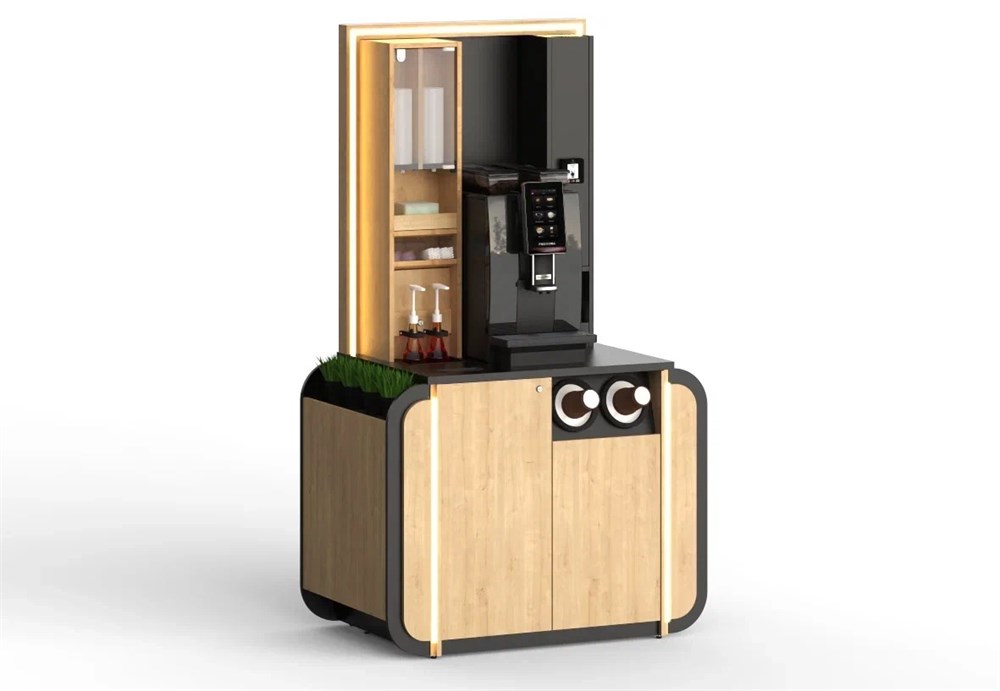 Габариты (ШхГ) : 1170х719 мм \; Высота : 1998 мм \; Назначение : Кофе-модуль самообслуживания \; Тип : напольный пристенный / островной \; Материал : ЛДСП Egger, пластик, оргстекло \; Декоры : фото складской программы размещены ниже \; Вес : 129 кг\;