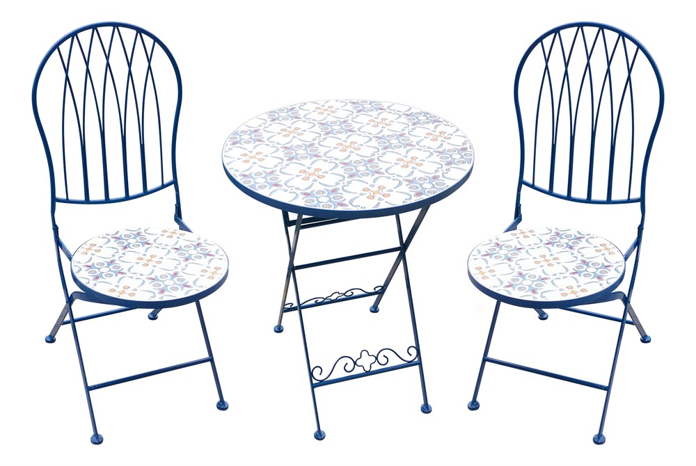 Стол (ДхВ) : 600х730 мм \; Стул (2 шт) (ШхГхВ) : 400х450х930 мм \; Материал каркаса : сталь \; Материал сиденья : пластик \; Цвет : синий/белый \; Вес : 38,2 кг \; Максимальная нагрузка стула : до 150 кг\;