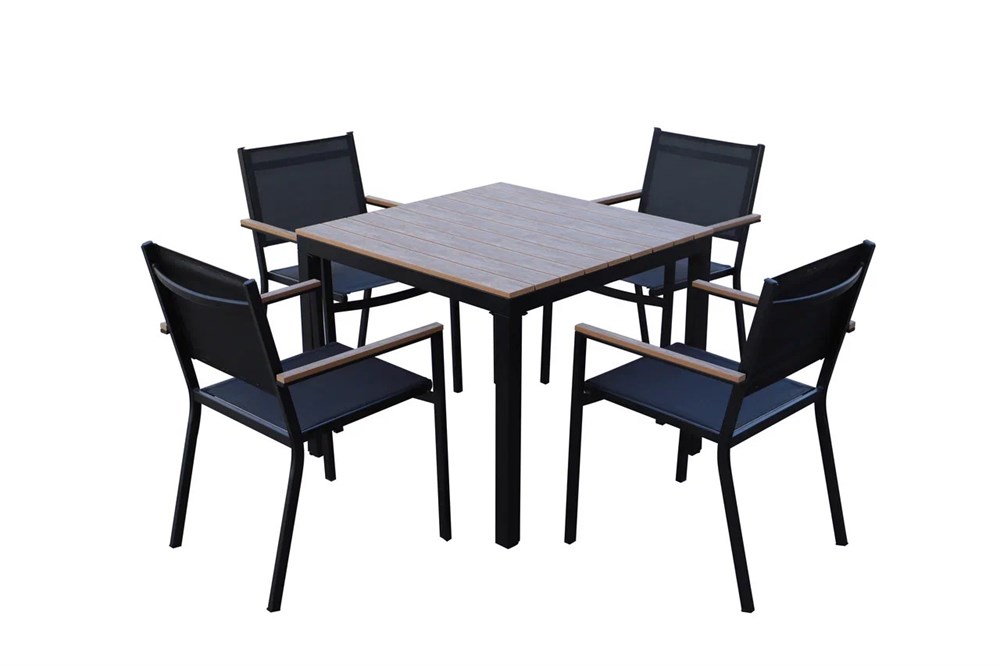 Стол (ШхГхВ) : 890х890х735 мм\; Максимальная нагрузка стула : до 120 кг\; Вес стула : 4,9 кг\; Вес стола : 18,5 кг\; Цвет текстилена : черный\; Цвет каркаса : черный\; Материал сиденья : текстилен усиленной прочности\; Материал столешницы : полимерная доска под тиковое дерево, толщина 20 мм\; Материал каркаса кресла : стальная труба 30х20 мм, толщиной 1 мм\; Материал каркаса стола : стальная труба 50х50 мм, толщиной 1,5 мм\; Высота от пола до сиденья : 450 мм\; Кресло (4 шт) (ШхГхВ) : 550х580х860 мм\;