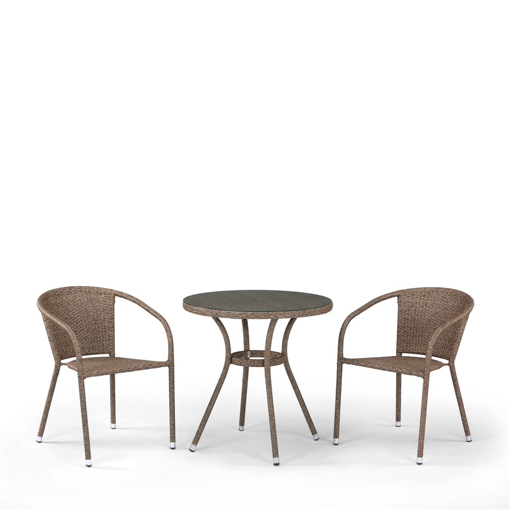 Размер стола (ДхВ) : 720х740 мм\; Размер стула (ШхГхВ) : 580х600х780 мм (2 шт)\; Материал столешницы : закаленное стекло - 5 мм\; Каркас : сталь\; Материал : искусственный ротанг\; Цвет : коричневый, светло-коричневый\; Вес : 24 кг\;