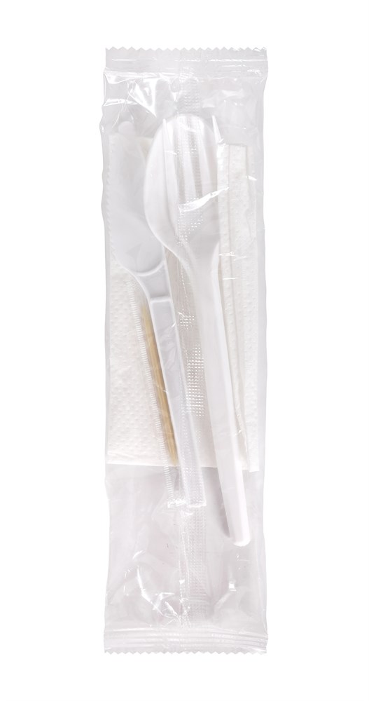 Комплект : столовая ложка, вилка, нож, бумажная салфетка, зубочистка