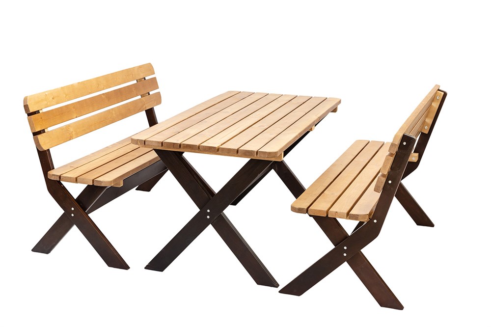 Стол разборный : 1480x770х750 мм \; Скамья разборная (2 шт.) : 1480x610х890 мм\; Материал : дерево хвойных пород\; Покрытие : пропитка + лак на водной основе\; Цвет столешницы, сиденья, спинки : орех\; Цвет опоры : венге\;