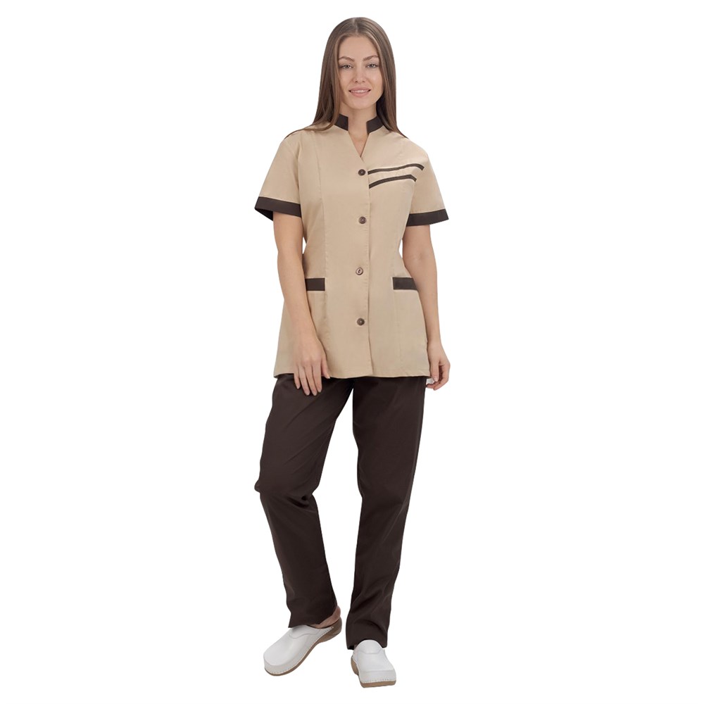 Состав : 65% полиэстер, 35% хлопок \; Застежка : на пуговицах\; Ткань : Тиси \; Плотность : 120 гр \; Отделка : коричнеывые манжеты и обтачки карманов \;