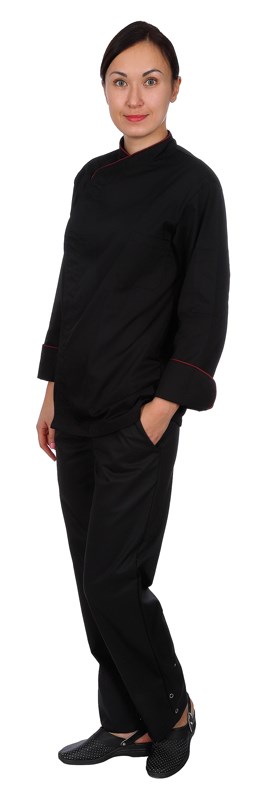 Куртка шеф-повара премиум черная рукав длинный с манжетом (отделка бордовый кант) [00012]