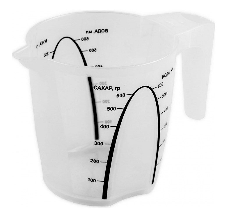 Длина : 165 мм \; Ширина : 105 мм \; Высота : 110 мм\; Мерные риски : для воды, сахара, муки\; Материал : пластик \;