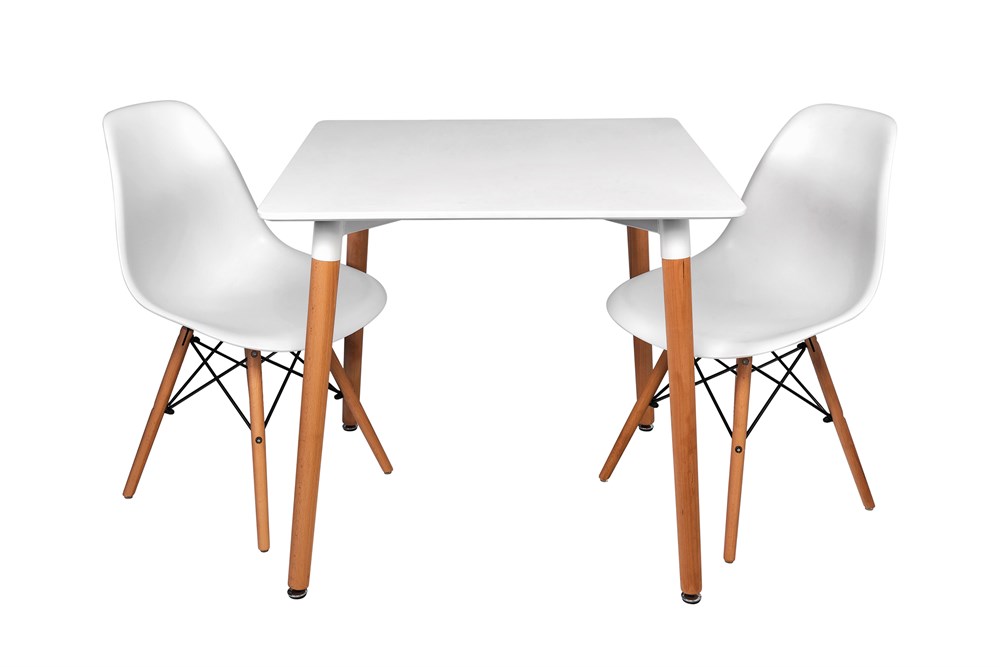 Габариты стола (ШхГхВ) : 800х800х730 мм \; Габариты стула (ШхГхВ) : 460х540х820 мм \; Высота от пола до сиденья стула : 430 мм \; Материал столешницы : мдф белый \; Материал сиденья стула : пластик \; Материал ножек стола и стула : массив бука, сталь \; Цвет сиденья стула : коричневый, зеленый, светло-зеленый, бежево-серый, темно-серый, оранжевый, голубой, бирюзовый, желтый, красный, розовый \; Нагрузка стула : 120 кг\;
