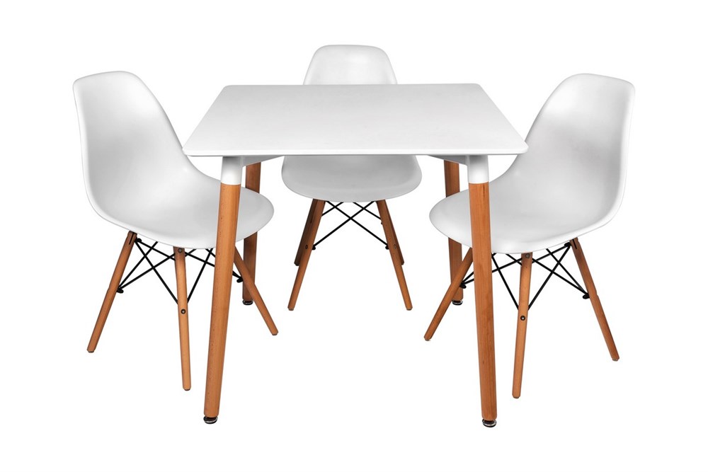 Габариты стола (ШхГхВ) : 800х800х730 мм\; Нагрузка стула : 120 кг\; Цвет сиденья стула : коричневый, зеленый, светло-зеленый, бежево-серый, темно-серый, оранжевый, голубой, бирюзовый, желтый, красный, розовый\; Материал ножек стола и стула : массив бука, сталь\; Материал сиденья стула : пластик\; Материал столешницы : мдф белый\; Высота от пола до сиденья стула : 430 мм\; Габариты стула (ШхГхВ) : 460х540х820 мм\;