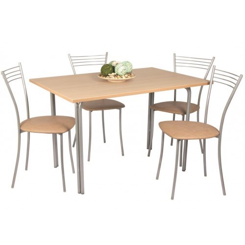 Габариты стола (ШхГхВ) : 1200х800х742 мм \; Габариты стула (ШхГхВ) : 400х530х900 мм \; Высота от пола до сиденья стула : 500 мм \; Материал столешницы : ЛДСП 22 мм с ABS-кромкой (2 мм) \; Цвета столешницы : 3 варианта ЛДСП 22 мм (фото ниже) \; Материал обивки стула : кожзам Экотекс \; Материал ножек стола и стула : металлическая труба, порошковая окраска \; Нагрузка стула : 100 кг\;