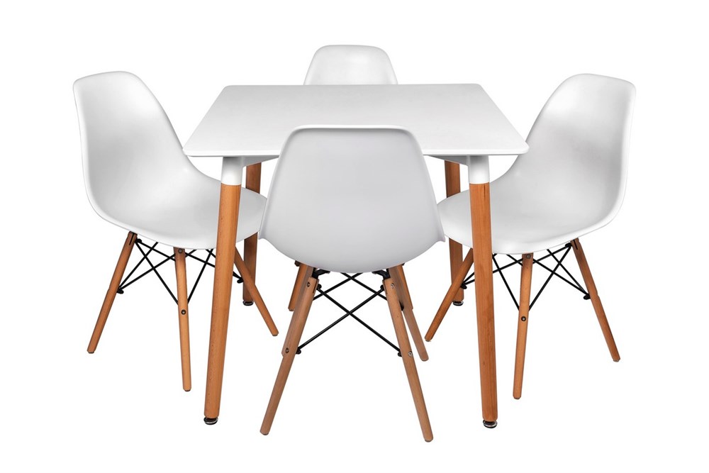 Габариты стола (ШхГхВ) : 800х800х730 мм\; Габариты стула (ШхГхВ) : 460х540х820 мм\; Высота от пола до сиденья стула : 430 мм\; Материал столешницы : мдф белый\; Материал сиденья стула : пластик\; Материал ножек стола и стула : массив бука, сталь\; Цвет сиденья стула : коричневый, зеленый, светло-зеленый, бежево-серый, темно-серый, оранжевый, голубой, бирюзовый, желтый, красный, розовый\; Нагрузка стула : 120 кг\;