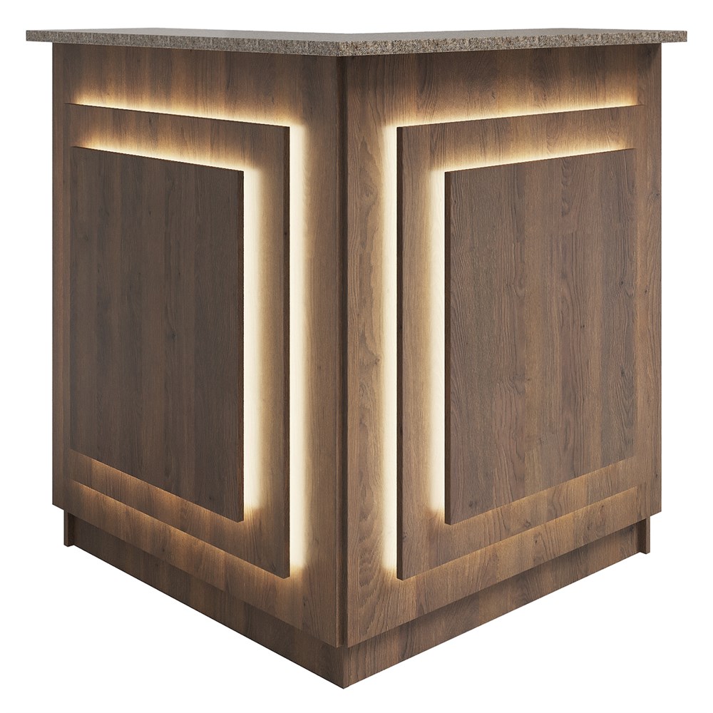 Габариты (ШхГхВ) : 1052х1052х1190 мм \; Материал корпуса : ЛДСП 16 мм., кромка ПВХ 2 и 0,4 мм\; Материал фасада : ЛДСП 16 мм., кромка ПВХ 0,4 мм\; Столешница рабочая и гостевая : ЛДСП 25 мм., кромка ПВХ 2 мм \; Подсветка : LED (под столешницей - дополнительная опция, в фасаде входит в стоимость)\;