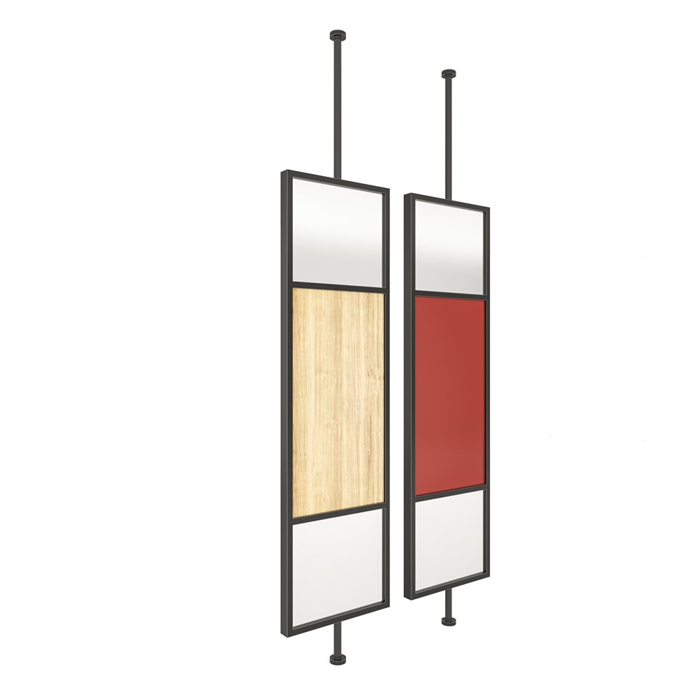 Габариты (ШхГхВ) : 600х60х2300-3000 мм\; ЛДСП : 16 мм, с кромкой ПВХ 0,4 мм\; Сварной профиль : 60х30 мм, D 40 мм\; Порошковая покраска : цвет черный\; Наполнение : зеркало серебро с ЛДСП или зеркало серебро с МДФ 16 мм, отделка ЛКМ\;