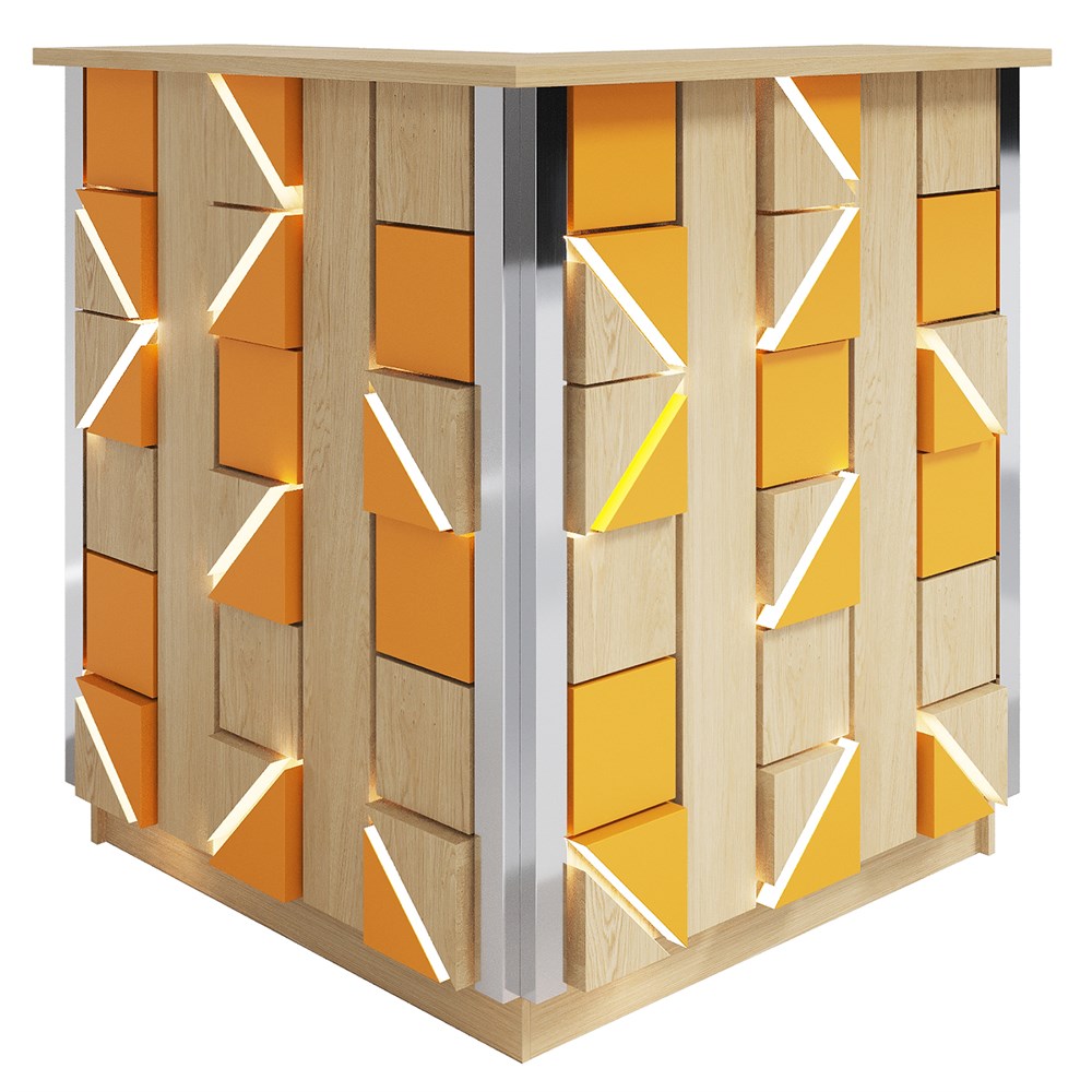 Габариты (ШхГхВ) : 1052х1052х1190 мм \; Материал корпуса : ЛДСП 16 мм., кромка ПВХ 2 и 0,4 мм \; Материал фасада : ЛДСП 16 и 25 мм., кромка ПВХ 0,4 мм\; Столешница рабочая и гостевая : ЛДСП 25 мм., кромка ПВХ 2 мм \; Подсветка : LED (под столешницей - дополнительная опция, в фасаде входит в стоимость)\;