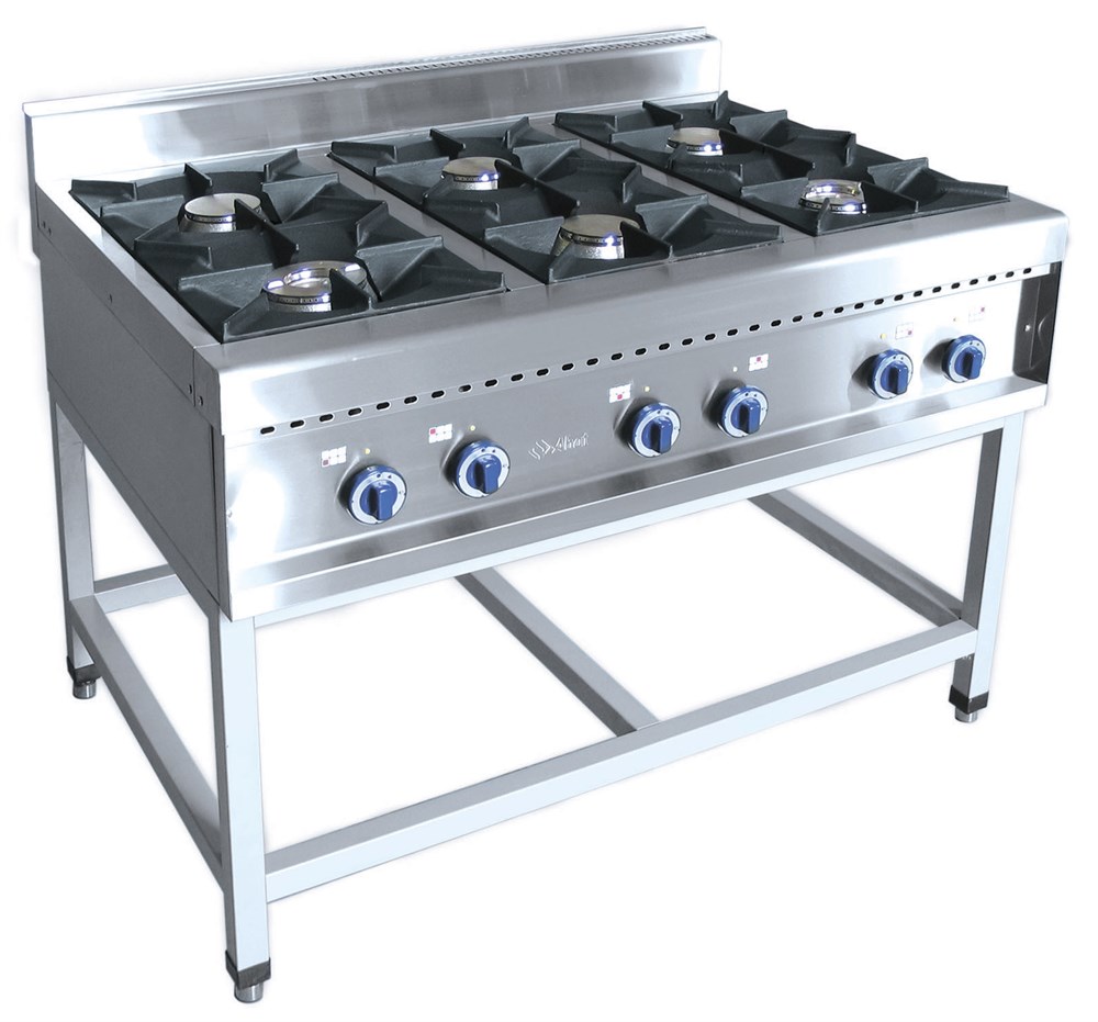 Питание: Газ\; Мощность, кВт: 37\; Установка: на подставке\; Количество конфорок: 6\; Духовой шкаф: нет\; Температура, нижний предел, °C: 100\; Температура, верхний предел, °С: 270\; Габаритные размеры, мм: 1200x899x944\;