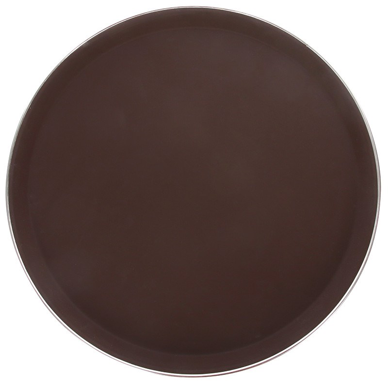 Поднос прорезиненный круглый 350 мм коричневый с ободком из нержавеющей стали [1400CT Brown]