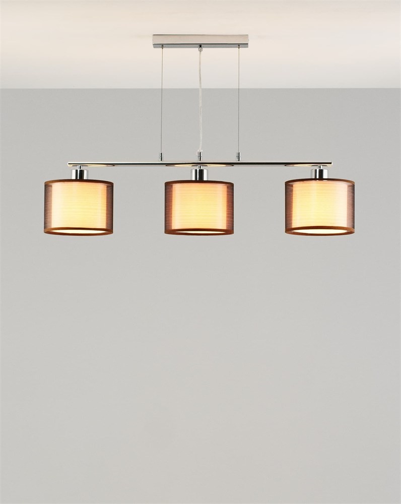 Габарит изделия : 1000х180х800 мм\; Лампы в комплекте : Нет\; Материал арматуры : металл\; Материал общий : металл, текстиль\; Материал плафонов : текстиль\; Место применения : зал, гостиная, спальня, кухня\; Наличие диммера : нет\; Наличие пульта д/у : нет\; Напряжение : 220-240 В\; Общая мощность светильника : 180 Вт\; Степень защиты IP : 20\; Способ крепления : На планку\; Тип лампы : Накаливания или LED\; Тип цоколя : E27\; Цвет : хром, коричневый\; Цвет арматуры : хром\; Цвет декора : хром\; Цвет плафонов : коричневый\; Электрика, тип цоколя + кол-во ламп + мощность : 3*E27*60 Вт\;