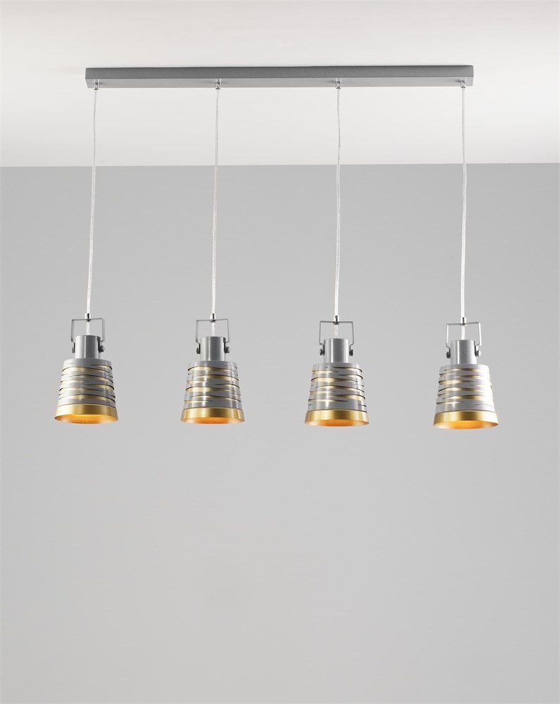 Габарит изделия : 1200x130х890 мм\; Лампы в комплекте : Нет\; Материал арматуры : металл\; Материал общий : металл\; Материал плафонов : металл\; Наличие диммера : нет\; Наличие пульта д/у : нет\; Напряжение : 220-240 В\; Общая мощность светильника : 240 Вт\; Степень защиты IP : 20\; Способ крепления : На планку\; Тип лампы : Накаливания или LED\; Тип цоколя : E27\; Цвет : серый, золотой\; Цвет арматуры : серый\; Цвет декора : серый\; Цвет плафонов : серый, внутри золотой\; Электрика, тип цоколя + кол-во ламп + мощность : 4*E27*60 Вт\;