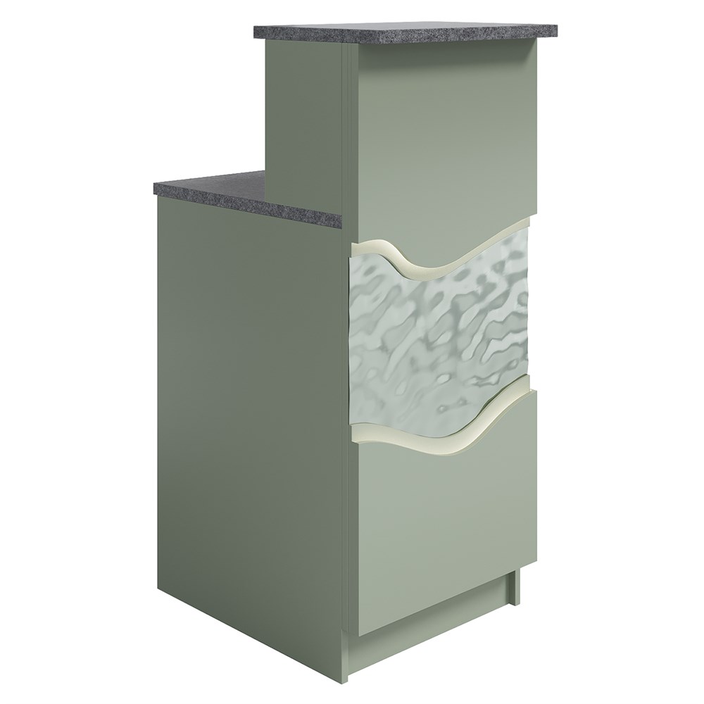 Габариты (ШхГхВ) : 504х686х1190 мм \; Материал корпуса : ЛДСП 16 мм., кромка ПВХ 2 и 0,4 мм \; Материал фасада : ЛДСП 16 мм., кромка ПВХ 0,4 мм., МДФ 16 мм., отделка ЛКМ – покраска по RAL Classic, нержавеющая сталь полированная 1 мм \; Столешница рабочая и гостевая : ЛДСП 25 мм., кромка ПВХ 2 мм \; Подсветка : LED (под столешницей - дополнительная опция, в фасаде входит в стоимость)\;