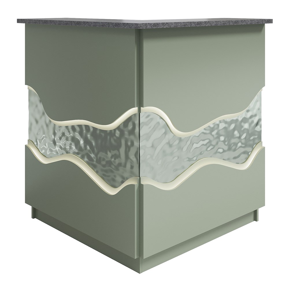 Габариты (ШхГхВ) : 1052х1052х1190 мм \; Материал корпуса : ЛДСП 16 мм., кромка ПВХ 2 и 0,4 мм\; Материал фасада : ЛДСП 16 мм., кромка ПВХ 0,4 мм., МДФ 16 мм., отделка ЛКМ – покраска по RAL Classic, нержавеющая сталь полированная 1 мм \; Столешница рабочая и гостевая : ЛДСП 25 мм., кромка ПВХ 2 мм \; Подсветка : LED (под столешницей - дополнительная опция, в фасаде входит в стоимость)\;