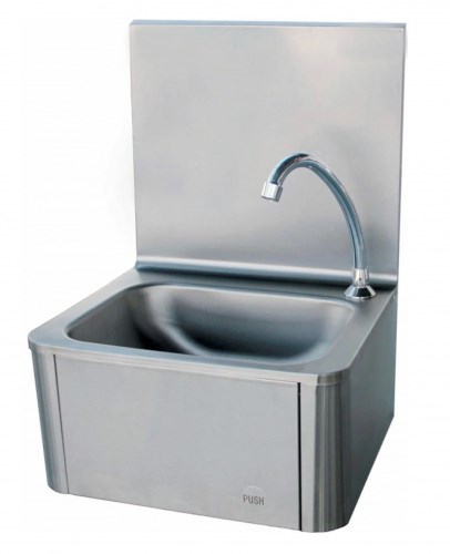 Тип: рукомойник\; Установка: настенный\; Материал емкости: нержавеющая сталь AISI 304\; Материал корпуса: нержавеющая сталь AISI 201\; Емкость: цельнотянутая\; Борт: Да\; Габаритные размеры, мм: 400х330х570\; Особенности: коленная кнопка\;