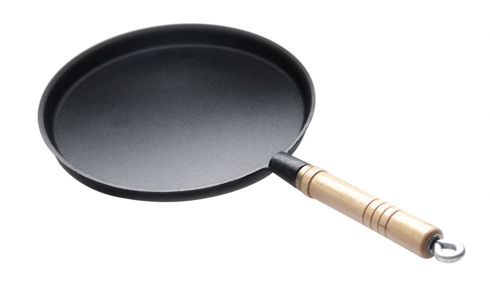 Высота, мм: 15\; Антипригарное покрытие: нет\; Индукционная посуда: да\; Материал: чугун, дерево\; Диаметр верхний, мм: 220\; Цвет: черный\; Особенности: для блинов\;