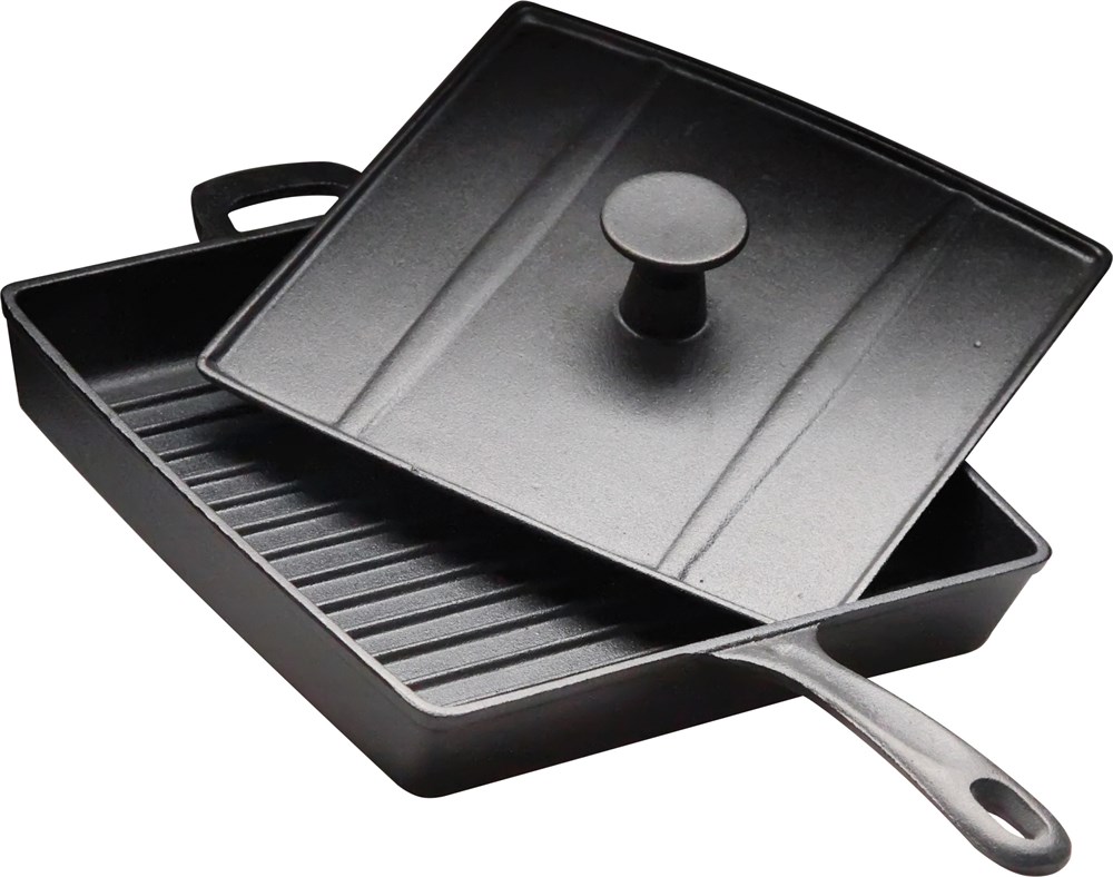 Сковорода чугунная рифленая 270х270 мм «Цыплята табака» с крышкой-прессом Luxstahl [HEGP30]