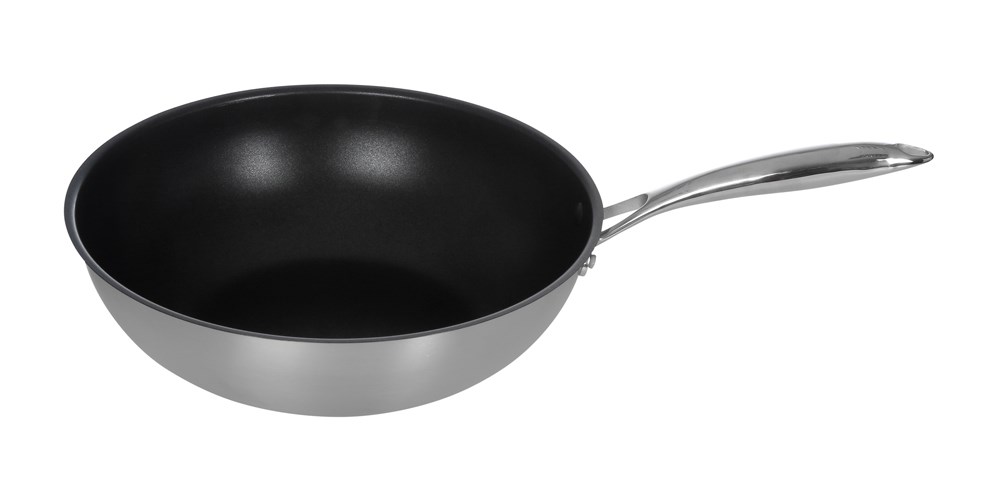 Антипригарное покрытие: да\; Индукционная посуда: Да\; Материал: нерж. сталь\; Высота, мм: 90\; Диаметр верхний, мм: 300\; Диаметр нижний, мм: 210\; Цвет: серебристый\; Особенности: тройное плоское дно, подходит для классических плит\;