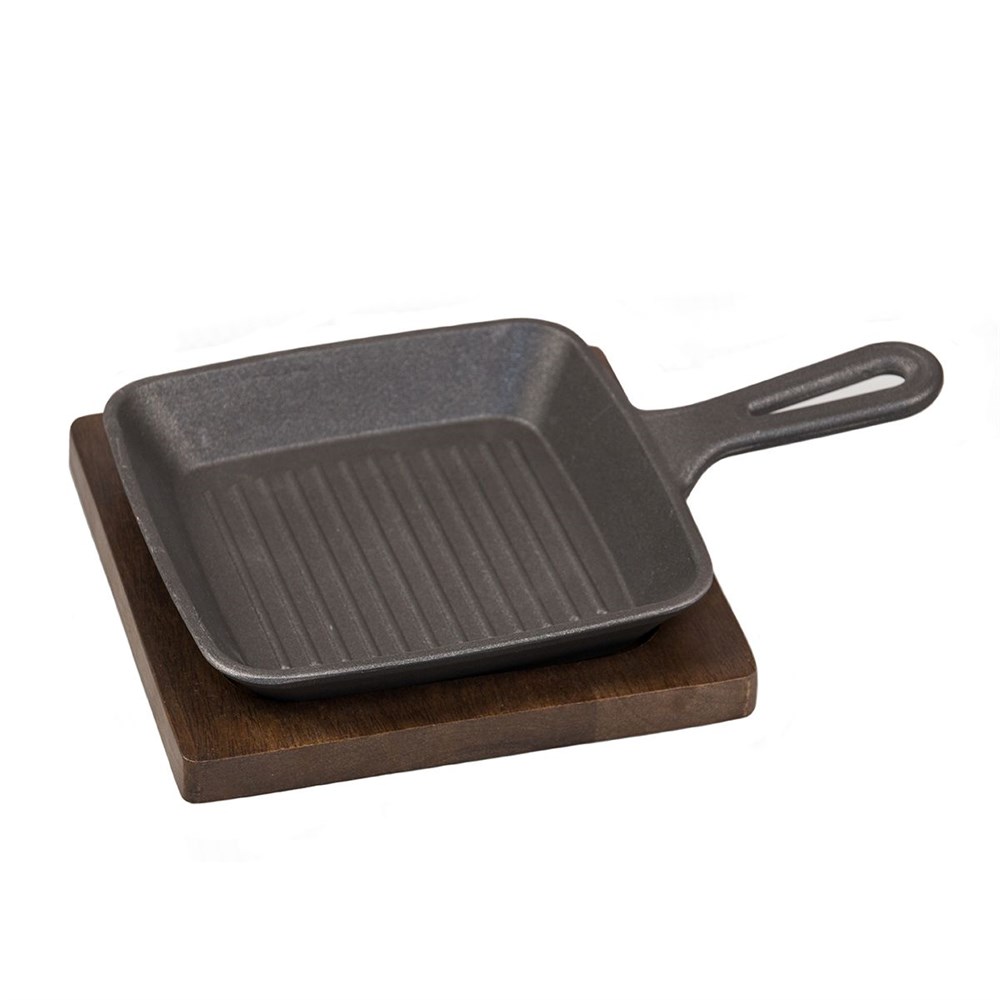 Сковородка алюминиевая черная (15.5*15.5*2,5 см) для подачи на деревянной подставке, P.L. Proff Cuis