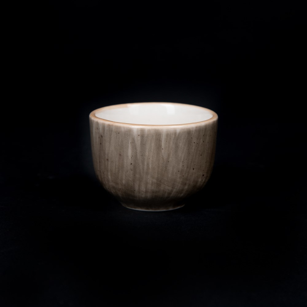 Тип посуды: соусник\; Серия: Natura\; Материал: фарфор\; Форма: круглая\; Основной цвет: серо-коричневый\; Диаметр, мм: 53\; Номинальный объем, мл: 55\; Особенности: снаружи серо-коричневый - внутри белый, ручная роспись\;