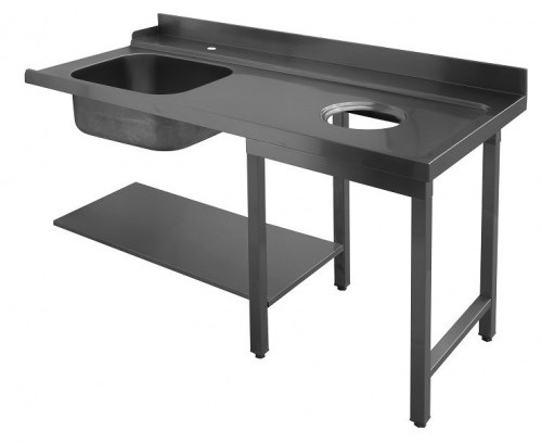 Тип: стол\; Для грязной посуды: Да\; Материал: нержавеющая сталь\; Дополнительно: борт, сплошная полка, отверстие для мусора\; Габаритные размеры, мм: 1200х700х850\;