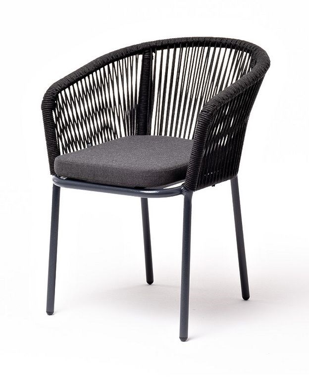 Габариты товара (ДхШхВ) : 570?620?775 мм\; Габариты упаковки (ДхШхВ) : 670?770?850 мм\; Материал плетения : эластичные ленты из высокопрочных полиэфирных волокон (роуп)\; Цвет плетения : темно-серый\; Вид роупа : круглый\; Материал каркаса : алюминий\; Цвет каркаса : темно-серый (RAL7024)\; Фактура покрытия каркаса : шагрень\; Высота сидения : 490 мм\; Материал ткани : полиэстер 100% плотностью 300гр/м2 с влагоотталкивающей пропиткой\; Цвет ткани : темно-серый\; Вес (Нетто) : 5 кг\;