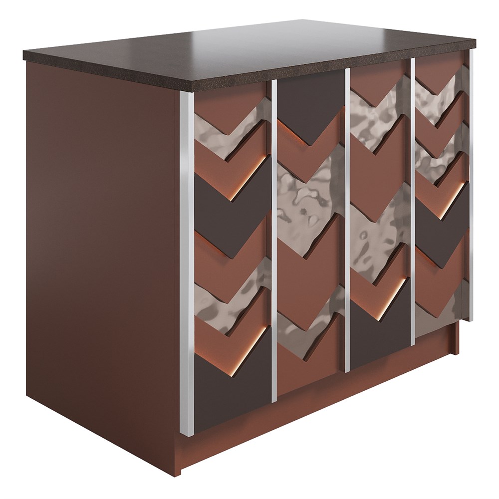 Габариты (ШхГхВ) : 1004х654х865 мм \; Материал корпуса : ЛДСП 16 мм., кромка ПВХ 2 и 0,4 мм\; Материал фасада : ЛДСП 16 мм., кромка ПВХ 0,4 мм., МДФ 16 и 25 мм., отделка ЛКМ – покраска по RAL Classic, нержавеющая сталь полированная 1 мм \; Столешница рабочая : ЛДСП 25 мм., кромка ПВХ 2 мм \; Подсветка : LED (под столешницей - дополнительная опция, в фасаде входит в стоимость)\;