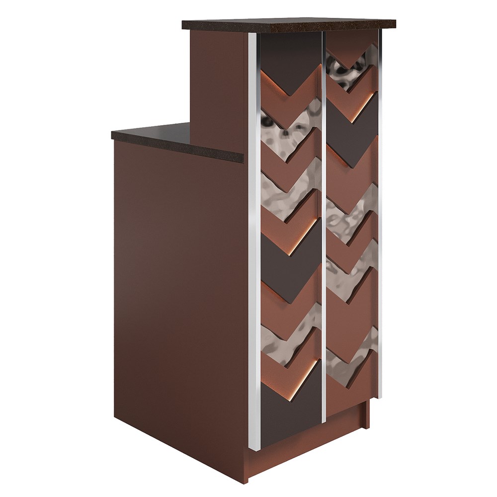 Габариты (ШхГхВ) : 504х686х1190 мм \; Материал корпуса : ЛДСП 16 мм., кромка ПВХ 2 и 0,4 мм \; Материал фасада : ЛДСП 16 мм., кромка ПВХ 0,4 мм., МДФ 16 и 25 мм., отделка ЛКМ – покраска по RAL Classic, нержавеющая сталь полированная 1 мм. \; Столешница рабочая и гостевая : ЛДСП 25 мм., кромка ПВХ 2 мм \; Подсветка : LED (под столешницей - дополнительная опция, в фасаде входит в стоимость)\;