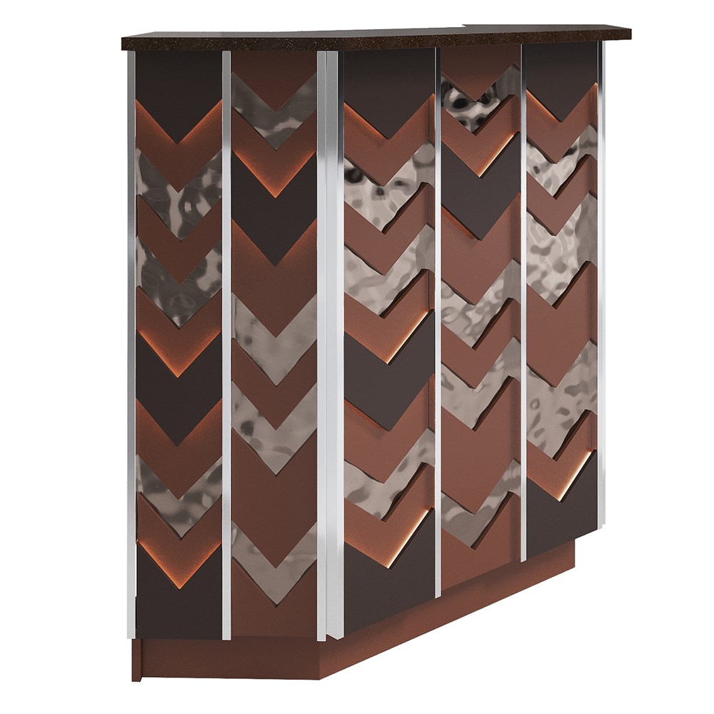 Габариты (ШхГхВ) : 1000х1000х1190 мм \; Материал корпуса : ЛДСП 16 мм., кромка ПВХ 2 и 0,4 мм\; Материал фасада : ЛДСП 16 мм., кромка ПВХ 0,4 мм., МДФ 16 и 25 мм., отделка ЛКМ – покраска по RAL Classic, нержавеющая сталь полированная 1 мм \; Столешница рабочая и гостевая : ЛДСП 25 мм., кромка ПВХ 2 мм \; Подсветка : LED (под столешницей - дополнительная опция, в фасаде входит в стоимость)\;