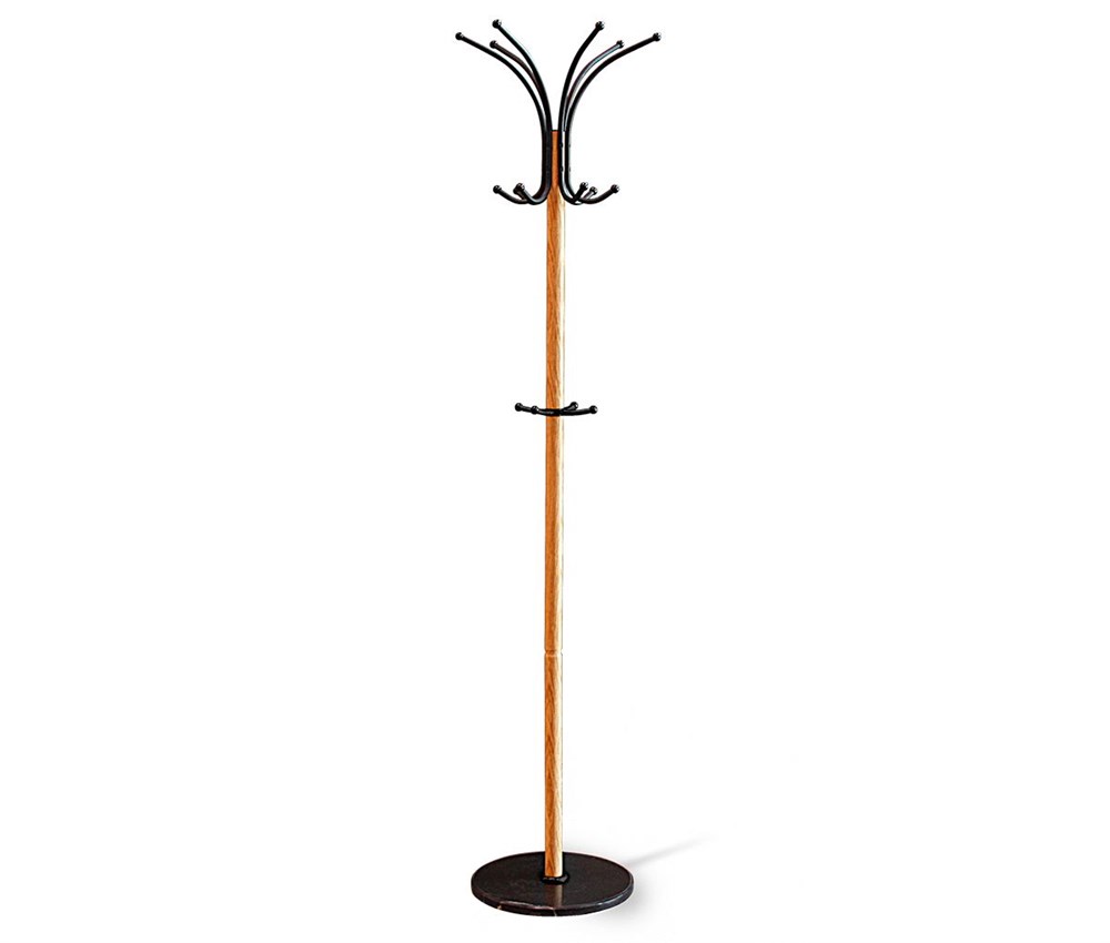Диаметр основания : 370 мм \; Габариты (ШхГ) : 380x380 мм \; Высота : 1890 мм \; Материал каркаса : металл \; Материал основания : мрамор \; Цвет каркаса/крючков : светлый орех/черный муар \; Вес : 6,9 кг\;