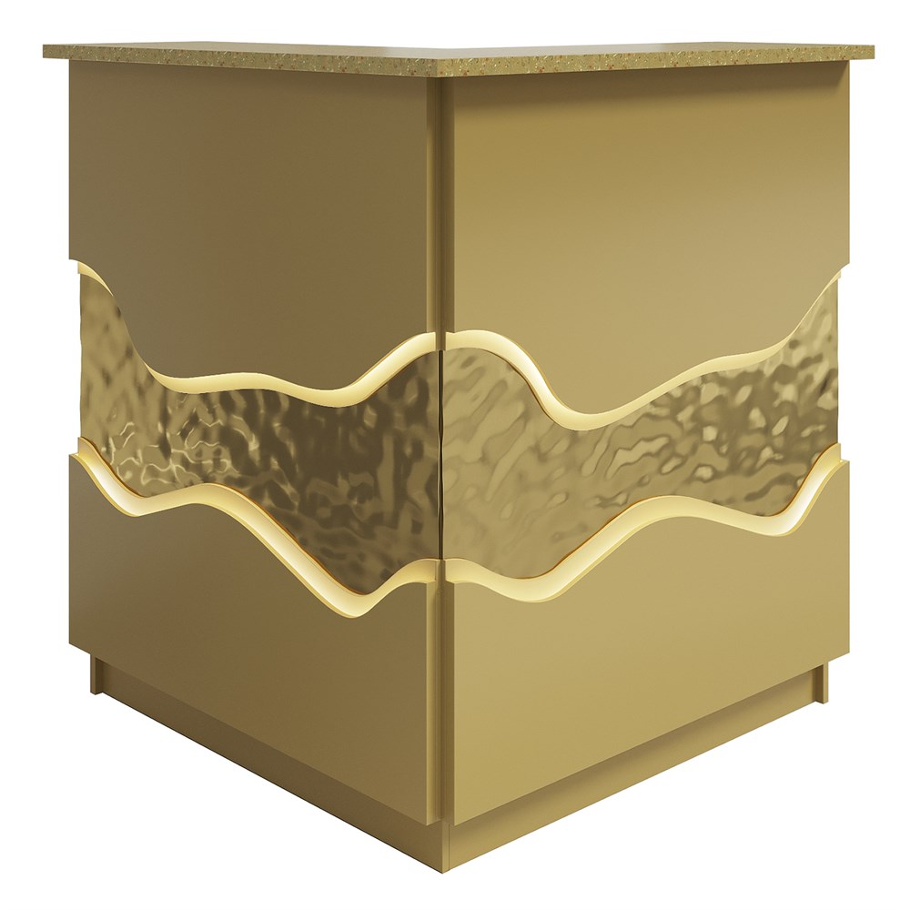 Габариты (ШхГхВ) : 1052х1052х1190 мм \; Материал корпуса : ЛДСП 16 мм., кромка ПВХ 2 и 0,4 мм. \; Материал фасада : ЛДСП 16 мм., кромка ПВХ 0,4 мм., МДФ 16 мм., отделка ЛКМ – покраска по RAL Classic, нержавеющая сталь 1 мм., покрытие нитрид титана \; Столешница рабочая и гостевая : ЛДСП 25 мм., кромка ПВХ 2 мм \; Подсветка : LED (под столешницей - дополнительная опция, в фасаде входит в стоимость)\;